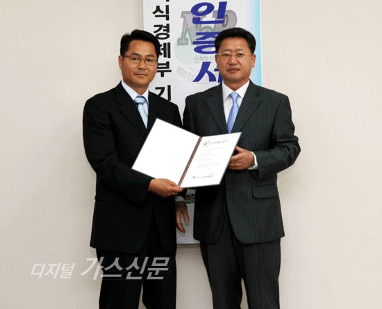 ▲ 케이엠씨의 김헌정 전무(왼쪽)가 NEP 인증서를 받고 기념사진을 찍고 있다.